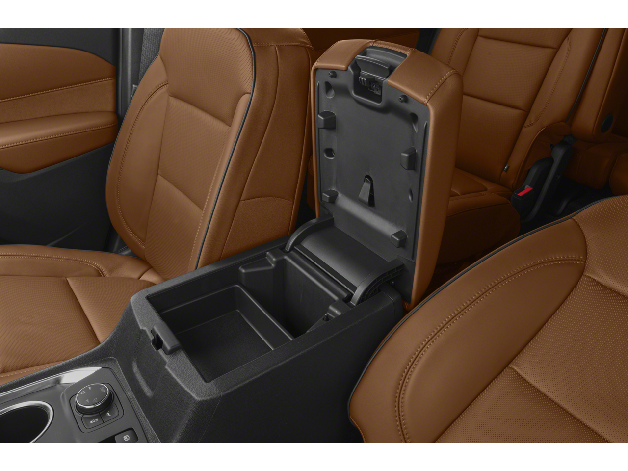 - Console, front center with 2 cup holders, covered storage bin with storage and removable tray