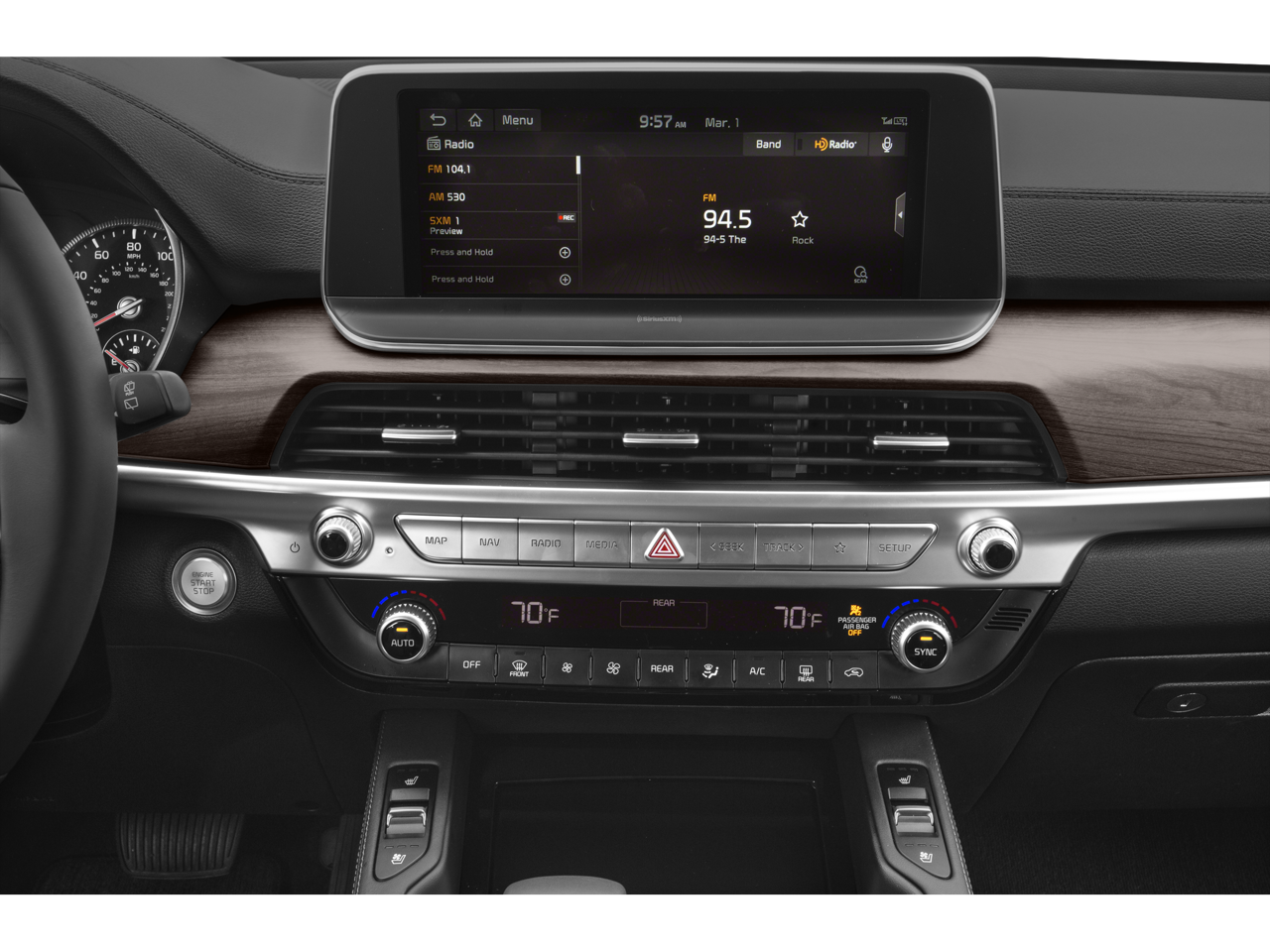 - Radio: AM/FM/MP3/SiriusXM Audio System -inc: UVO link infotainment system, w/smartphone integration for remote commands and remote vehicle status, 6-speaker, support for Android Auto and Apple CarPlay, 10.25" Thin Film Transistor (TFT) touch-screen display, navigation, a total of 6 USB charge ports in all rows, Bluetooth® wireless connectivity w/voice recognition (a Bluetooth® enabled cell phone is required to use Bluetooth® wireless technology) and Multi-Bluetooth connectivity, allowing 2 phone connections simultaneously