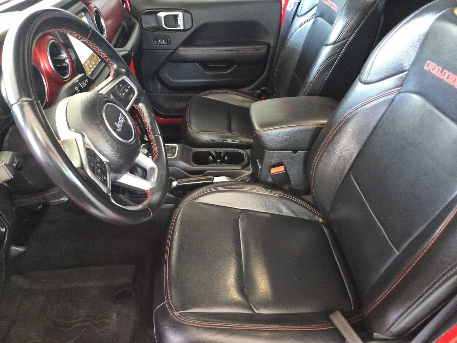 BODY COLOR 3-PIECE HARD TOP Freedom Panel Storage Bag, Rear Window Defroster, Rear Sliding Window, No Soft Top, TRANSMISSION: 8-SPEED AUTOMATIC (850RE) Transmission Skid Plate, Selec-Speed Control, BLACK, LEATHER TRIMMED BUCKET SEATS #1 Seat Foam Cushion, Leather Wrapped Shift Knob, Premium Door Trim Panel, Full Length Floor Console Premium Armrest, Leather Wrapped Park Brake Handle, Rear Armrest w/Cupholder Seat, TRAILER TOW PACKAGE Trailer Hitch Zoom, Class IV Receiver Hitch, Heavy Duty Engine Cooling, 240 Amp Alternator, MOPAR SPRAY IN BEDLINER, REMOTE START SYSTEM, ENGINE: 3.6L V6 24V VVT UPG I W/ESS (STD). Jeep Rubicon with Firecracker Red Clearcoat exterior and Black interior features a V6 Cylinder Engine with 285 HP at 6400 RPM*.