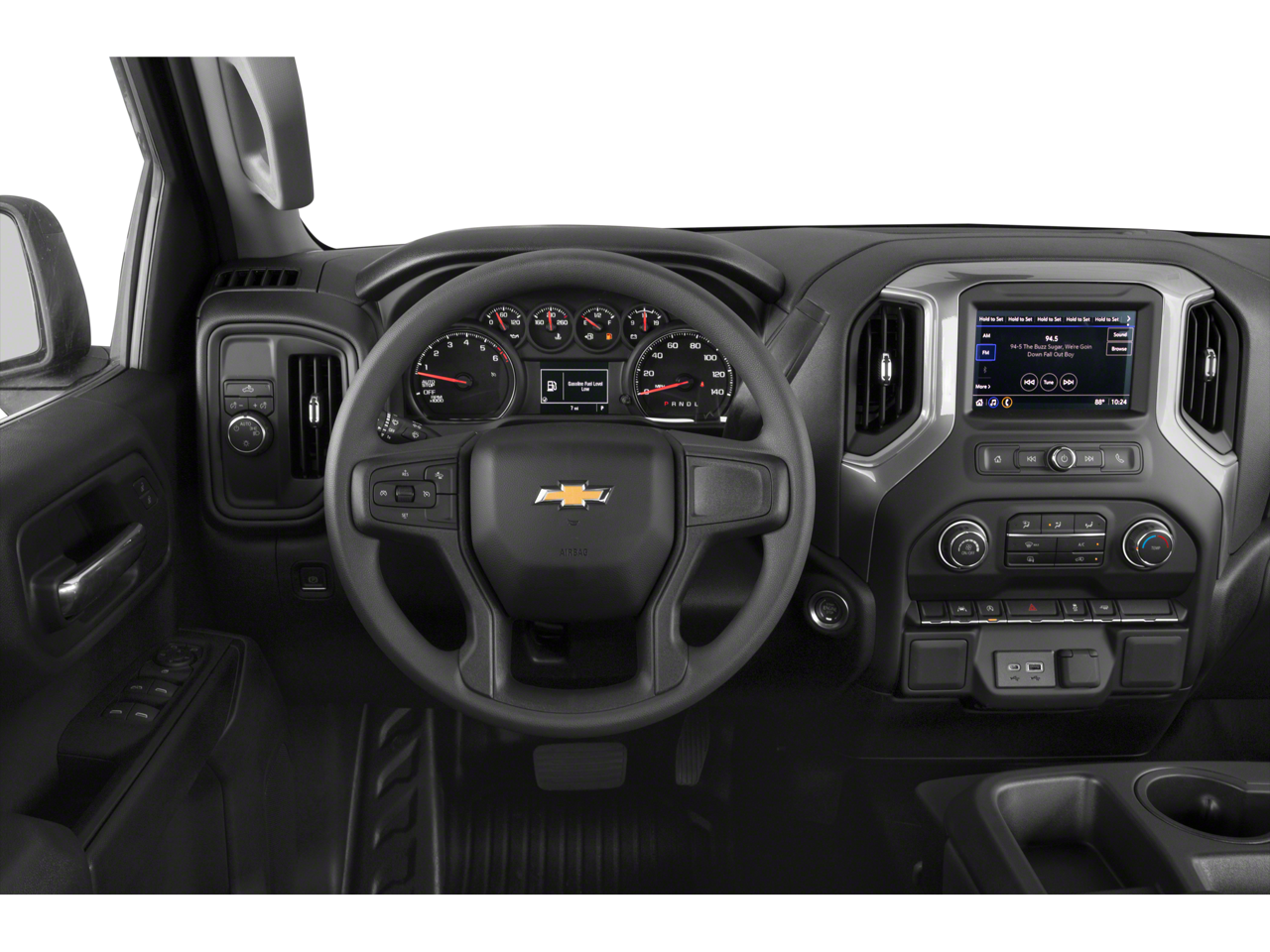 ENGINE, 5.3L ECOTEC3 V8 (355 hp [265 kW] @ 5600 rpm, 383 lb-ft of torque [518 Nm] @ 4100 rpm); featuring available Dynamic Fuel Management that enables the engine to operate in 17 different patterns between 2 and 8 cylinders, depending on demand, to optimize power delivery and efficiency, WT SAFETY PACKAGE includes (UD7) Rear Park Assist, (UKC) Lane Change Alert with Side Blind Zone Alert, (UFB) Rear Cross Traffic Alert-Braking, (UKK) Rear Pedestrian Alert, (V46) Chrome front bumper, (VJH) Chrome rear bumper and (DP6) high gloss Black mirror caps (Certain vehicles built prior to 7-11-22 may be forced to include (00Y) Not Equipped with Rear Park Assist, which removes Rear Park Assist. See dealer for details or the window label for the features on a specific vehicle. Vehicles built on or after 7-11-22 will include (UD7) Rear Park assist. Includes (UD7) Rear Park Assist and (U12) Perimeter Lighting. Includes (V76) recovery hooks. WT CONVENIENCE PACKAGE includes (AKO) tinted windows, (C49) rear-window defogger, (K34) cruise control and (DLF) power mirrors, AUTO-LOCKING REAR DIFFERENTIAL, WHEELS, 17 X 8 (43.2 CM X 20.3 CM) BRIGHT SILVER PAINTED ALUMINUM, GLASS, DEEP-TINTED, MIRRORS, OUTSIDE HEATED POWER-ADJUSTABLE When (PQA) WT Safety Package is ordered, includes (DP6) high gloss Black mirror caps.), AUDIO SYSTEM, CHEVROLET INFOTAINMENT 3 SYSTEM 7 diagonal color touchscreen, AM/FM stereo. Additional features for compatible phones include: Bluetooth® audio streaming for 2 active devices, voice command pass-through to phone, wired Apple CarPlay® and Android Auto® capable. (STD), TRANSMISSION, 10-SPEED AUTOMATIC, ELECTRONICALLY CONTROLLED with overdrive and tow/haul mode. Includes Cruise Grade Braking and Powertrain Grade Braking. Chevrolet Work Truck with SUMMIT WHITE exterior and JET BLACK interior features a 8 Cylinder Engine with 310 HP at 5600 RPM*.
