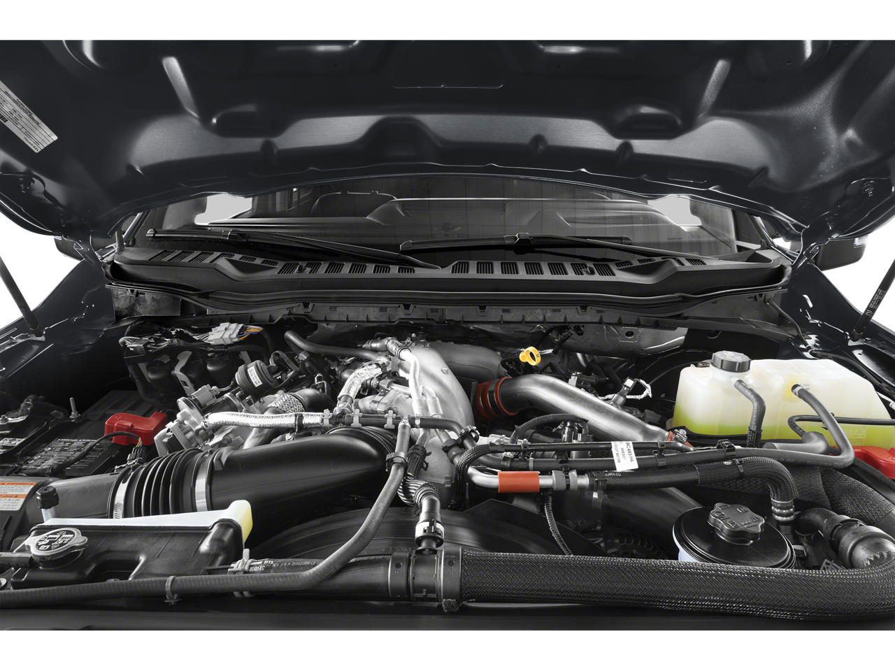 ENGINE: 6.7L 4V OHV POWER STROKE V8 TURBO DIESEL B20 manual push-button engine-exhaust braking and Operator Commanded Regeneration (OCR), 250 Amp Alternator, 34 Gallon Fuel Tank, 3.31 Axle Ratio, Dual AGM 68 AH Battery, CHROME PACKAGE Unique Chrome Mirror Caps, Tires: LT275/65Rx20E BSW Automatic Transmission, Spare may not be the same as road tire, Wheels: 20 Chrome PVD Aluminum, Chrome Door Handles, 6 Angular Bright Anodized Step Bars, Chrome Exhaust Tip, ELECTRONIC-LOCKING W/3.31 AXLE RATIO, TRANSMISSION: TORQSHIFT 10-SPEED AUTOMATIC SelectShift and selectable drive modes: normal, eco, slippery roads, tow/haul and off-road. Ford LARIAT with Oxford White exterior and Black Onyx interior features a 8 Cylinder Engine with 475 HP at 2600 RPM*.